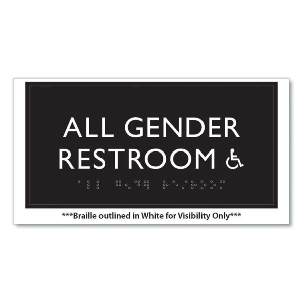 Universally and easily recognizable white graphics. Raised tactile graphics with grade 2 braille. Meets Americans with Disabilities Act (ADA) requirements. Includes double-side adhesive tape for mounting to door or wall.