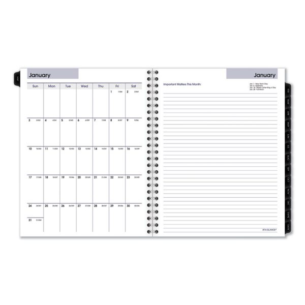 - Monthly: tabbed, full months with unruled blocks on left page, notes space on right.