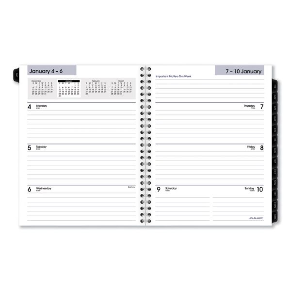 - Weekly: one week per two-page spread; ruled block-style for open scheduling; past, current and two future months reference.