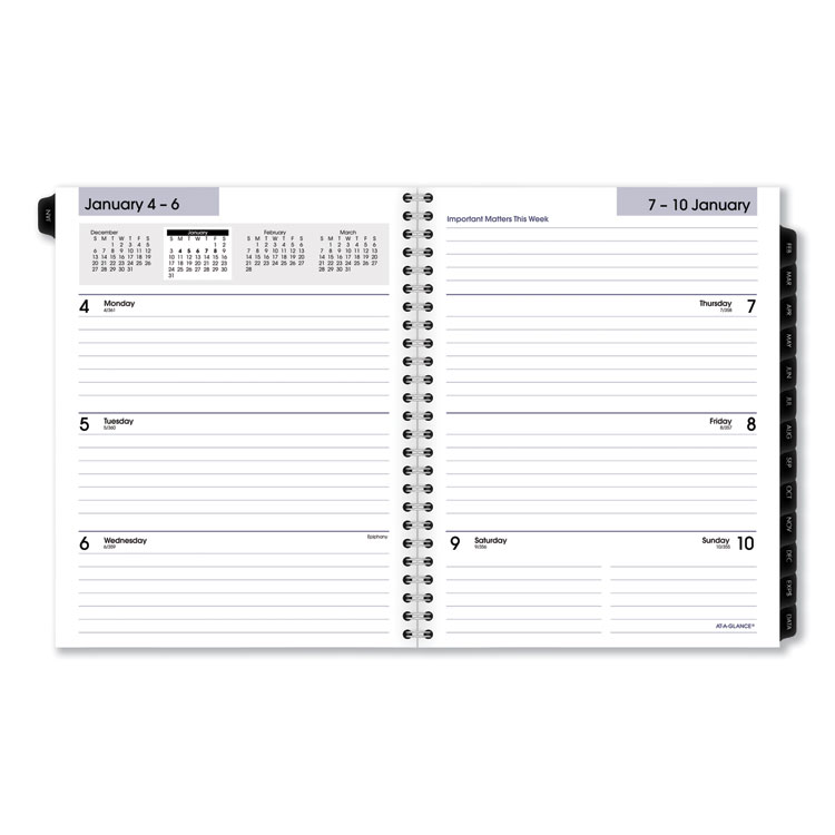Weekly: one week per two-page spread; ruled block-style for open scheduling; past, current and two future months reference. Monthly: tabbed, full months with unruled blocks on left page, notes space on right. Separate telephone/address and special 16-page information sections. Printed on high-quality with superior ink bleed resistance.