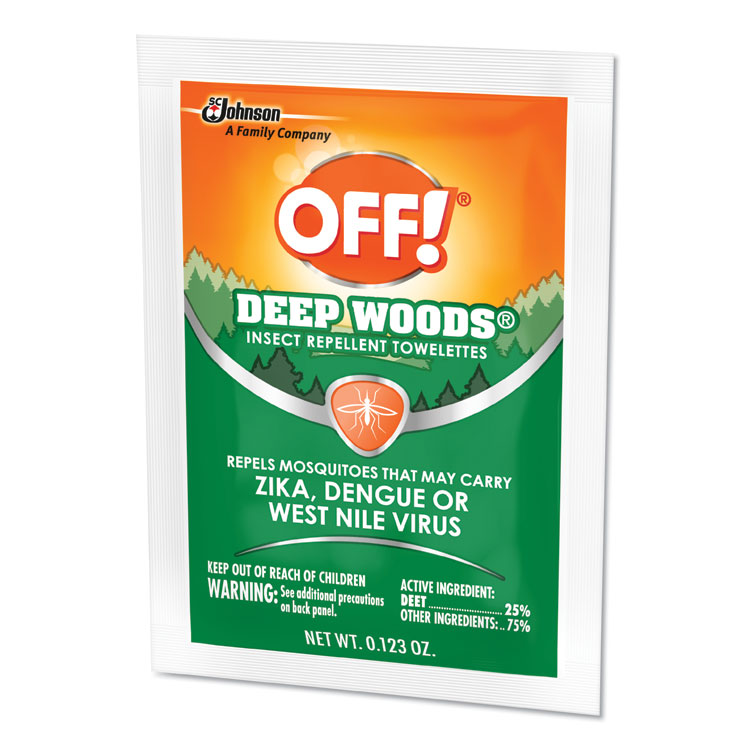 Each towelette features a formula containing 25% DEET. The unique towelette design makes carrying them a quick and simple process - simply place them in the car or supply kit. Effective formula repels mosquitoes that may carry West Nile virus and also provides protection against ticks, biting fleas, gnats and chiggers. Non-greasy formula lasts up to eight hours, will not dry out and resists perspiration.