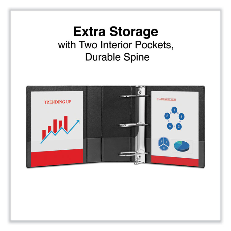 Slant ring design allows you to store more documents than with comparable round ring binders. Open-and-close triggers work effortlessly for fast access to binder contents. Binder includes a label holder for quick and easy identification of contents. Stylish linen finish material produces a high-quality look that resists messy fingerprints. Poly material is nonstick so inserts won't lift print. Two inside pockets provide extra storage for loose documents. Rings mounted on back so pages lie flat.