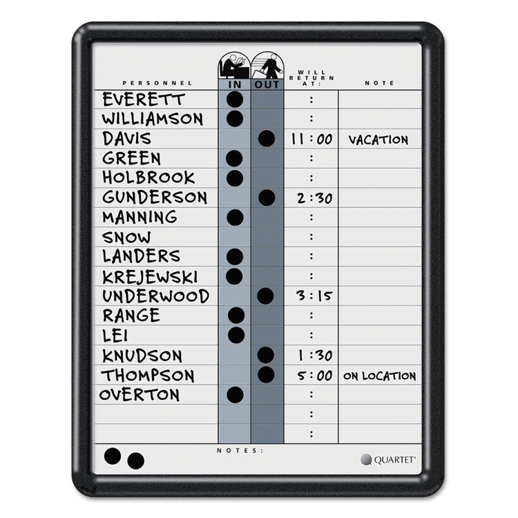 Maintain better organization with an in/out board to track employee status. Comprehensive personnel board tracks in/out status and notes for up to 18 employees on an ultra-durable, ultra-smooth DuraMax® porcelain surface that will not scratch, dent, stain or ghost. Delivers superior performance when communication is needed in high-profile, heavy-use office environments. Steel-backed porcelain creates a magnetic surface for posting documents. Effectively display information on easy-to-read grid lines with alternating gray shading. Easy-to-clean writing surface requires minimal use of Quartet® cleaning solutions. Easily secure board to wall with included mounting system. Contemporary black plastic frame complements any office's décor. Includes accessory magnets and marker.