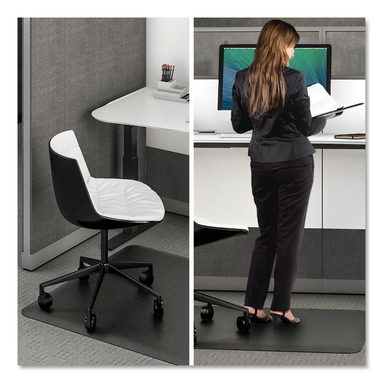 This dual purpose cushioned mat combines the comfort and ergonomic benefit of an anti-fatigue mat with the smooth rolling surface of a traditional deflecto® office chair mat. Designed for use with standing desks and adjustable height workstations. The mat is ideal for users looking to transition effortlessly from sitting to standing. With 3/8" thick anti-fatigue support foam, this mat is comfortable on the feet, promotes wellness and reduces fatigue while standing. It also protects flooring from wear and tear caused by wheeled office chairs. The mat can also be used to cover worn, damaged or stained flooring.