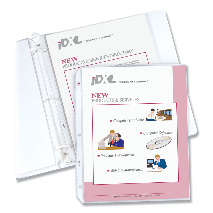 Sheet protectors are widely used as a tool to keep documents in their original condition. Once inserted into the holder, the documents instantly have a plastic, protective cover, which will help eliminate damage and tearing while they are being stored. This is especially important for high-use documents that are accessed on a regular basis. Document holders have strong, reinforced edges, which prevent tears. Top-loading sheet protectors are pre-punched to fit standard three-ring binders. This allows for documents to remain in their original state. The acid-free polypropylene material eliminates photocopy transfer. Sheet protectors are a durable storage option for important documents and reference materials. This product will be cheerfully replaced with one of equal value if defective in materials, manufacturing or packaging at the time of purchase. Except for such replacement, this product is sold without warranty or liability even though defect, damage or loss is caused by negligence or other fault.