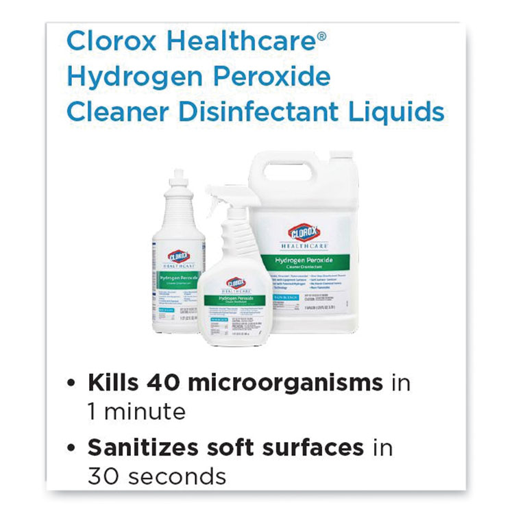 Clorox Healthcare® Hydrogen Peroxide Cleaner Disinfectant kills microorganisms quickly on a broad range of surfaces. It is a ready-to-use one-step noncorrosive disinfectant cleaner that cleans and disinfects faster than the competition. It has 30 to 60 second hard surface disinfecting times on most bacteria and viruses. On soft surfaces like, curtains, chairs and couches, it kills bacteria in just 30 seconds. It is safe to use on several types of fabrics such as polyester and cotton and it will not harm canvas, nylon or polypropylene. It is EPA-registered to kill pathogens on both hard and soft surfaces. Conscious of patient and staff comfort, this cleaner it is formulated with no harsh chemical odors, fumes, or added fragrances. Intended for use in commercial settings.