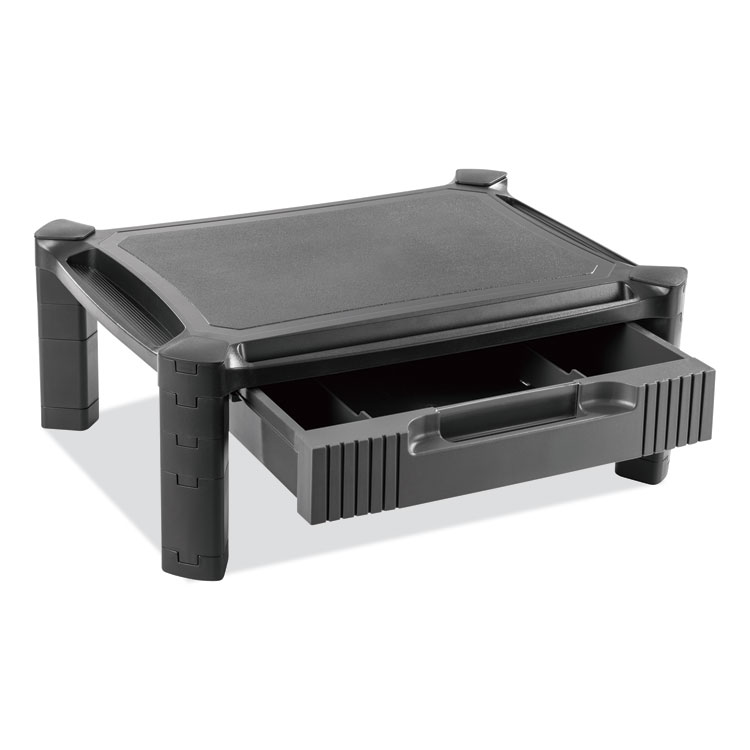 Set your monitor at an ergonomically correct height and maximize desk space with our height-adjustable smart stand. This stand features a contemporary design with stacking columns, letting you choose the ideal height for your monitor. With ample clearance between the stacking columns, this stand provides plenty of room to fit a small laptop or supplies beneath. A non-skid column base and 22 lb. of each shelf support help to ensure your monitor or other electronic devices rest securely while you work. Built-in cable organizer and drawer maximize desktop space and minimize clutter. Accommodates most 13"-32" monitors, laptop, printers, and other office machines.