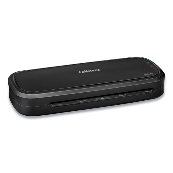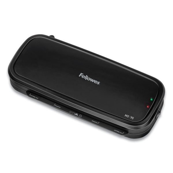Fellowes M5-95 Laminator is designed for light use in the home or home office. It accommodates 9.5" wide documents and features advanced temperature control for consistent results. Offers a heat setting for 3-mil and 5-mil hot pouches. Heats up in 4 minutes. Release lever disengages pouch for re-centering or removal. Includes laminating starter kit. Perfect for use in the office, home office or school.