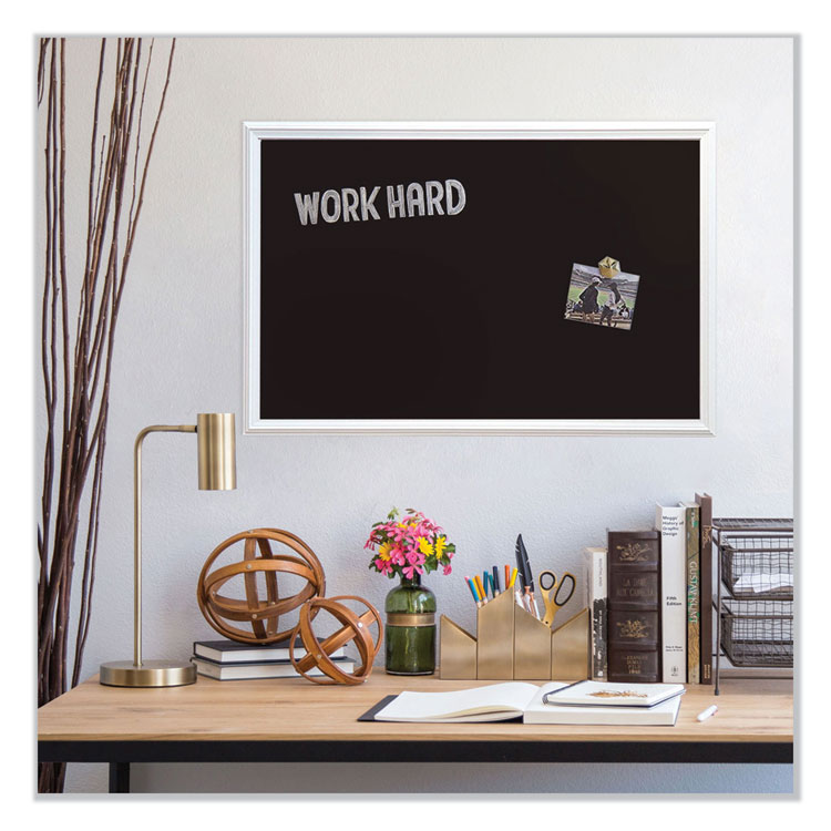 Modern, magnetic chalk board with Décor design wood frame is the perfect, fully functional solution for frequent use in the office, in the classroom, at home or in any commercial space. Clean and contemporary with a classic underlying design, this is the ideal choice when you wish to add touch of subtle style to your wall. The board's black writing surface requires minimal cleaning care and features excellent stain- and ghost-resistant properties. After long periods of continuous use, simply use any dry erase board spray or wet dry erase board wipe to bring the writing surface back to life. And though all forms of liquid-chalk markers work well with this board's surface, U Brands liquid chalk markers provide the ultimate writing and eras-ability experience. The included universal mounting system allows you to hang the board vertically or horizontally to fit your allocated space.