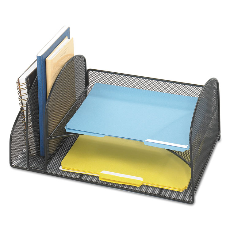 Organizer helps maximize desktop space. Features two vertical sections that can hold file folders and binders and two horizontal sections that can accommodate any letter size documents. Bottom shelf also accommodates the mesh drawer organizer (3262BL), sold separately. Durable steel mesh construction.