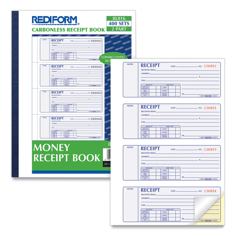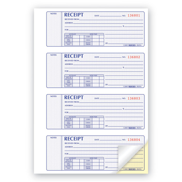 Receipt Book, Two-Part Carbonless, 7 x 2.75, 4 Forms/Sheet, 400 Forms Total