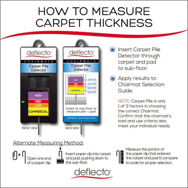 The SuperMat® chair mat is a versatile choice for frequent use on carpets up to 1/2" thick and is well-suited for a variety of commercial and home office applications. Easy-glide rolling surface provides smooth chair movement to help minimize stress and strain on users back, legs and feet. Bottom studs grip the carpet securely and keeps the chair mat from moving. Deflecto’s Free and Clear® non-orthophthalate, non-cadmium formula promotes a healthy work environment.