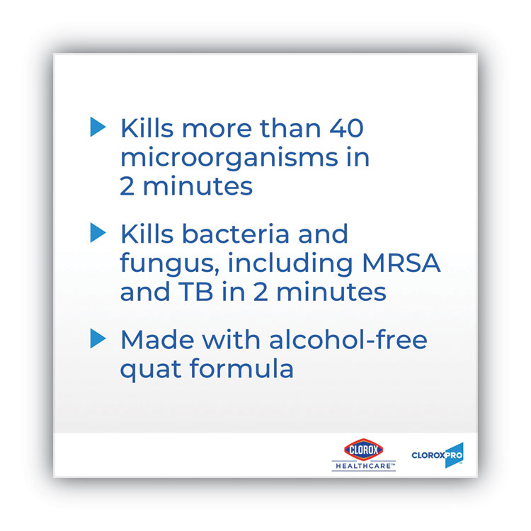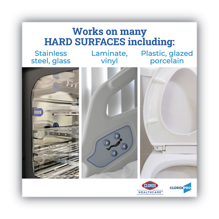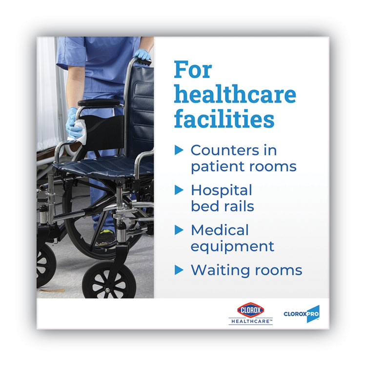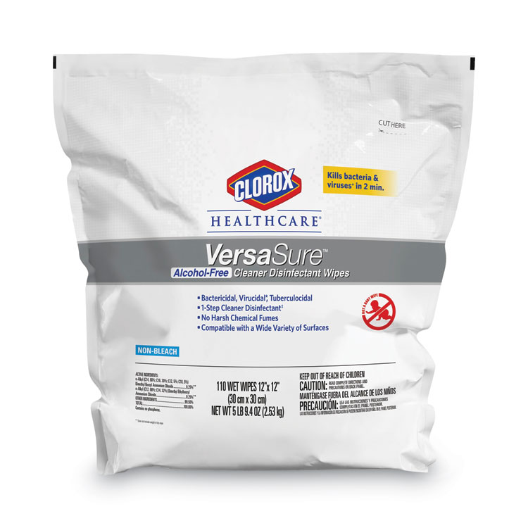 Clorox® Healthcare VersaSure Cleaner Disinfectant Wipes kill microorganisms quickly on a broad range of surfaces. These strong and durable alcohol-free wipes are a one-step solution to cleaning and disinfecting. VersaSure™ wipes are EPA-registered to kill pathogens on hard surfaces in as fast as 30 seconds for most bacteria and viruses. Designed for patient and staff comfort, these wipes are formulated with no harsh chemical odors, fumes, or added fragrances. Intended for use in commercial settings.